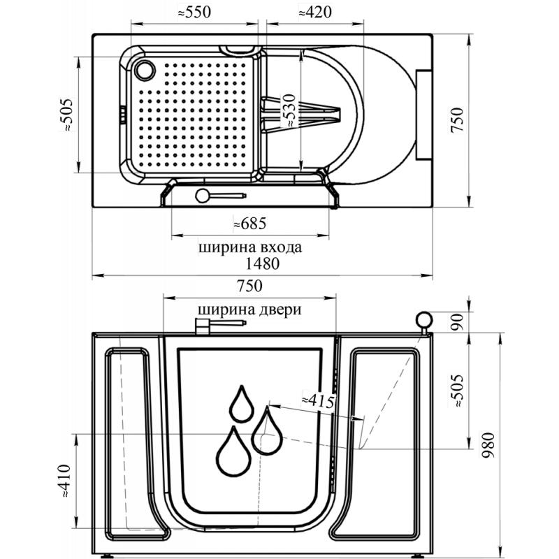 Люди с ограниченными возможностями не всегда могут объективно оценить температуру воды по своим ощущениям, поэтому блок управления оснащен контроллером температуры. Так же он удобен, если по регламенту процедуры требуется поддержание определенной температуры воды. Место расположения водозаборного устройства продумано и ток воды не может причинить неудобства или дискомфорта никаким частям тела. Удобное взаиморасположение дверцы и сидения ванны позволяет людям с ограниченными возможностями самостоятельно перемещаться в ванну и из нее. При необходимости ванна может быть оснащена дополнительными ручками. Дно ванны противоскользящее, что обеспечивает полную безопасность. Как только ванна начинает наполняться водой, дверца блокируется, что защищает от случайного открытия и пролития воды во время процедуры. Дверца оборудована водонепроницаемой изоляцией.