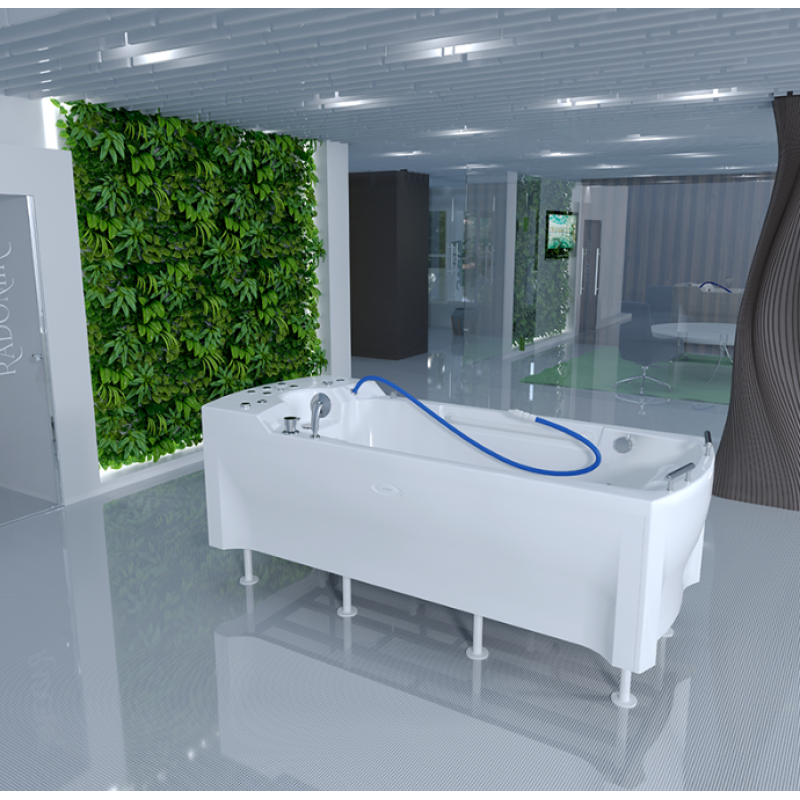 Профессиональная терапевтическая ванна "Титан" является отдельно стоящей и закрыта декоративными панелями со всех четырех сторон. Для обеспечения удобного и безопасного входа в ванну и выхода из нее в комплекте можно заказать ступени и две ручки внутри чаши. Рельефная поверхность дна ванны изготовленная по технологии Radomir® Non-Slip предотвращает скольжение и защищает от падений.