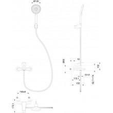 Комплектация: смеситель, душевой шланг, держатель для душа, душевая лейка, эксцентрики, монтажный комплект