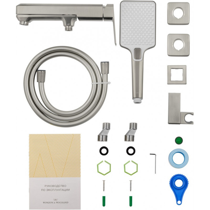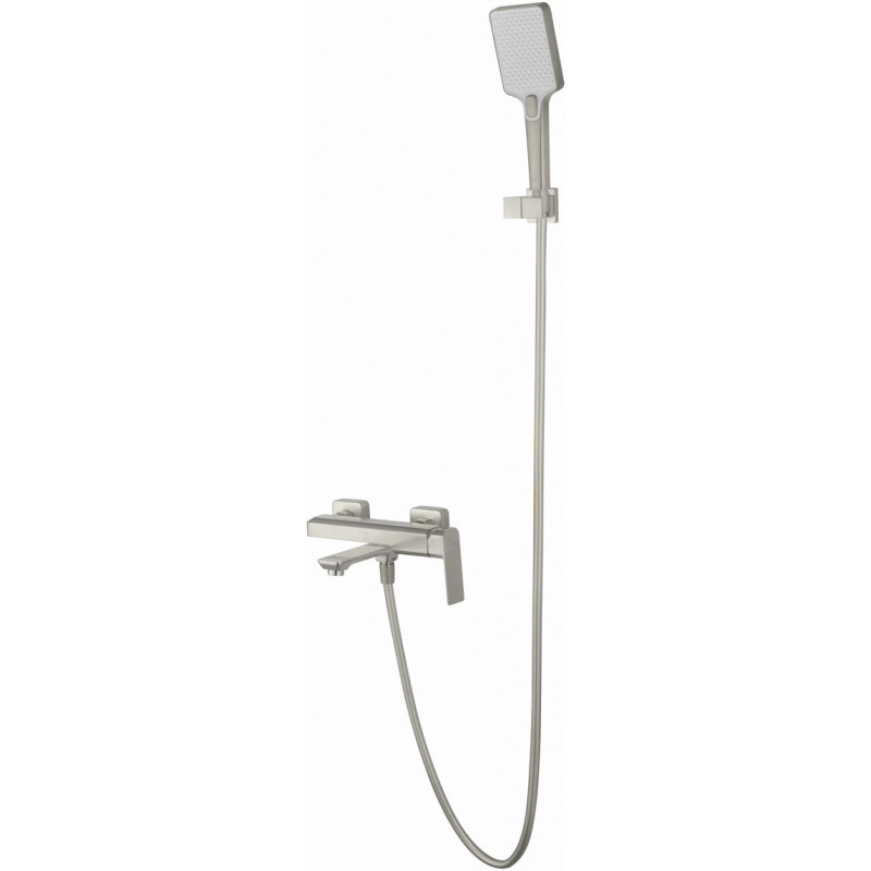 Комплектация: смеситель, душевой шланг, держатель для душа, душевая лейка, эксцентрики, монтажный комплект