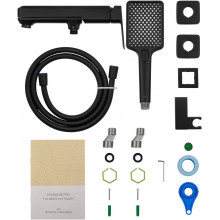 Комплектация: смеситель, душевой шланг, держатель для душа, душевая лейка, эксцентрики, монтажный комплект