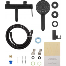 Комплектация: смеситель, душевой шланг, держатель для душа, душевая лейка, эксцентрики, монтажный комплект