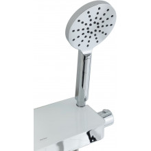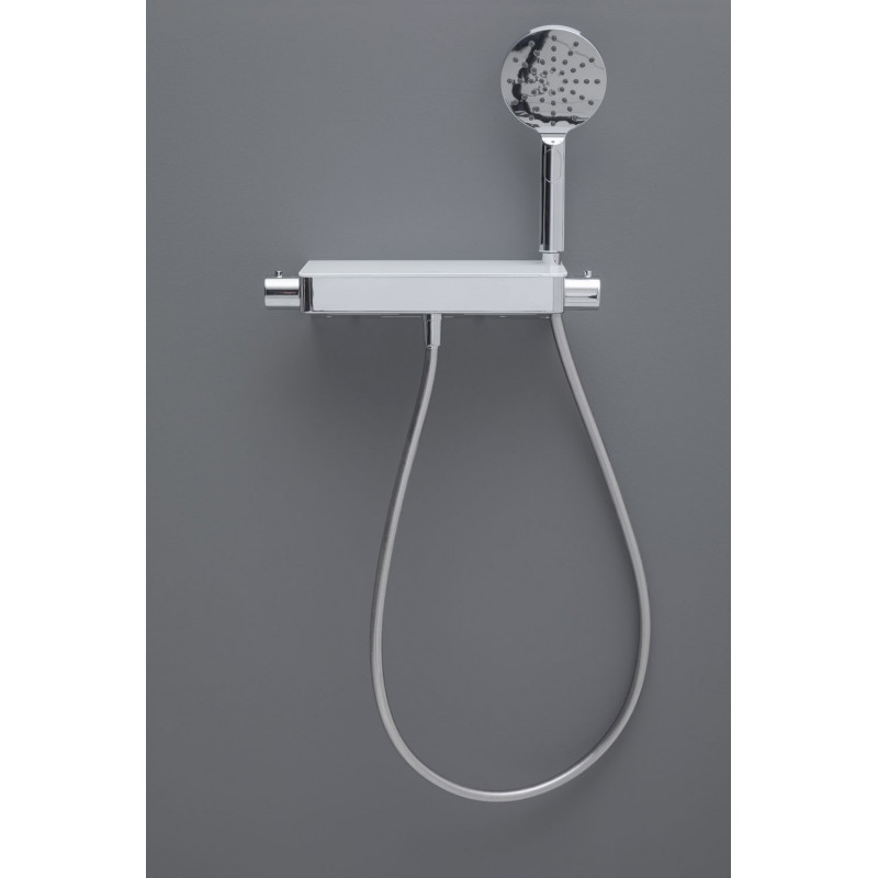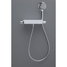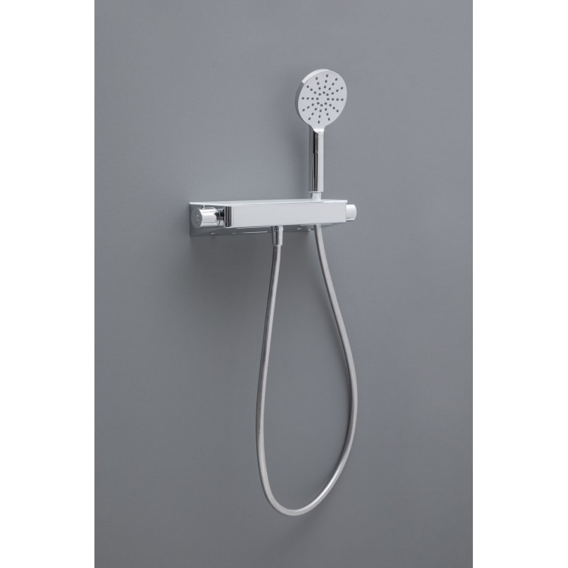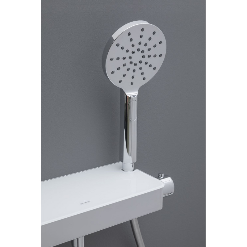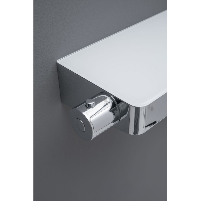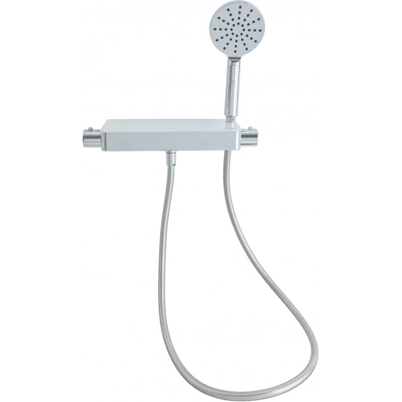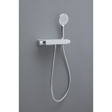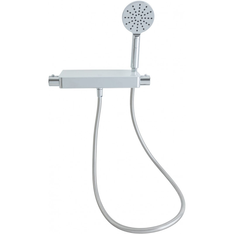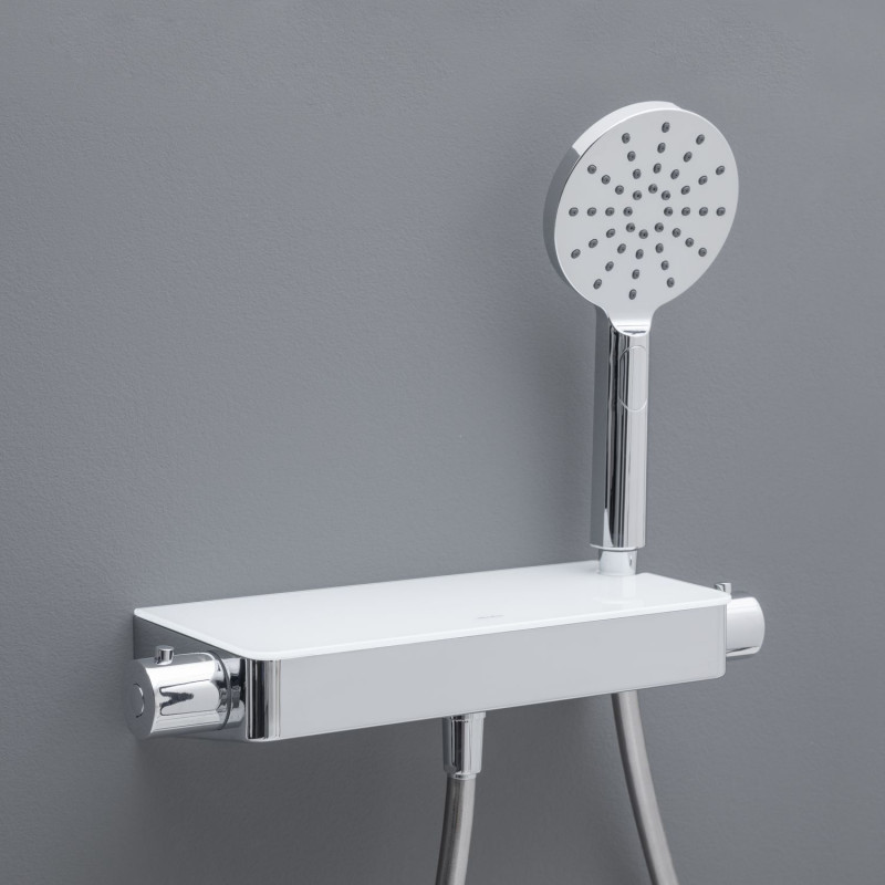 Смеситель для душа Allen Brau Fantasy 5.11002-00 термостатический — эстетичная модель, выполнена в виде удобной душевой полки со встроенным креплением ручного душа. Смеситель изготовлен из высококачественной латуни, полка - из стекла белого цвета. Термостатический картридж обеспечивает не только плавное управление и точную регулировку напора и температуры воды, но и защиту от ожогов. Переключение режимов производится поворотом правого рычажка. Трехрежимный ручной душ и шланг с защитой от скручивания длиной 1.5 метра в комплекте.