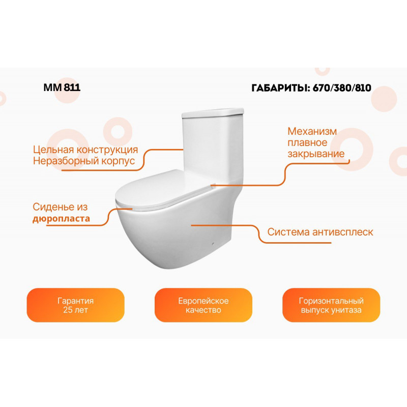 Гигиеничность и простота ухода: моноблок единое целое с чашей и бочком, что исключает скопление микробов и грязи на стыке.