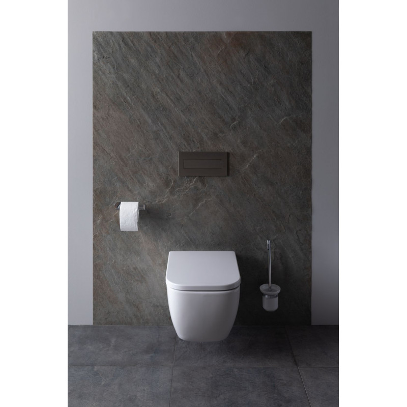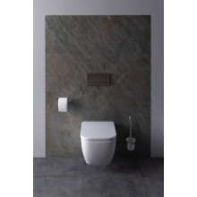 Поверхность изделия глянцевая, а механизм смыва определяется системой инсталляции, встроенной в стену. Решение выглядит технологично и минималистично.