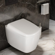 В комплекте присутствует легкосъемное сидение с крышкой, оснащенное системой микролифт (для плавного и бесшумного опускания). Крепления к чаше выполнены из стали, а само сидение - из долговечного полимерного материала – дюропласта с антибактериальным покрытием. Снятие осуществляется одним нажатием кнопки.