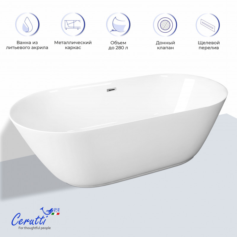 Акриловая отдельностоящая ванна Cerutti SPA Como CT9901 в современном стиле Modern c антискользящим покрытием выполнена в классическом белом цвете и имеет практичную форму овала.