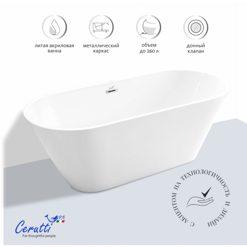 Ванна Cerutti SPA Resia CT10302 выполнена из качественного акрила, который хорошо сохраняет тепло и тактильно приятен. Устойчивость и практичность ванны достигается армированием дна стекловолокном и использованием прочного металлического каркаса. Помимо этого, в местах крепежа каркаса установлены дополнительные усиленные закладные для придания жесткости конструкции, что гарантирует максимально долгий срок эксплуатации ванны.