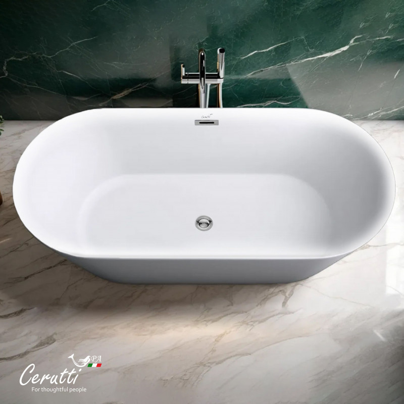 Акриловая отдельностоящая ванна Cerutti SPA Skye CT10513 в современном стиле c антискользящим покрытием выполнена в классическом белом цвете и имеет овальную форму.