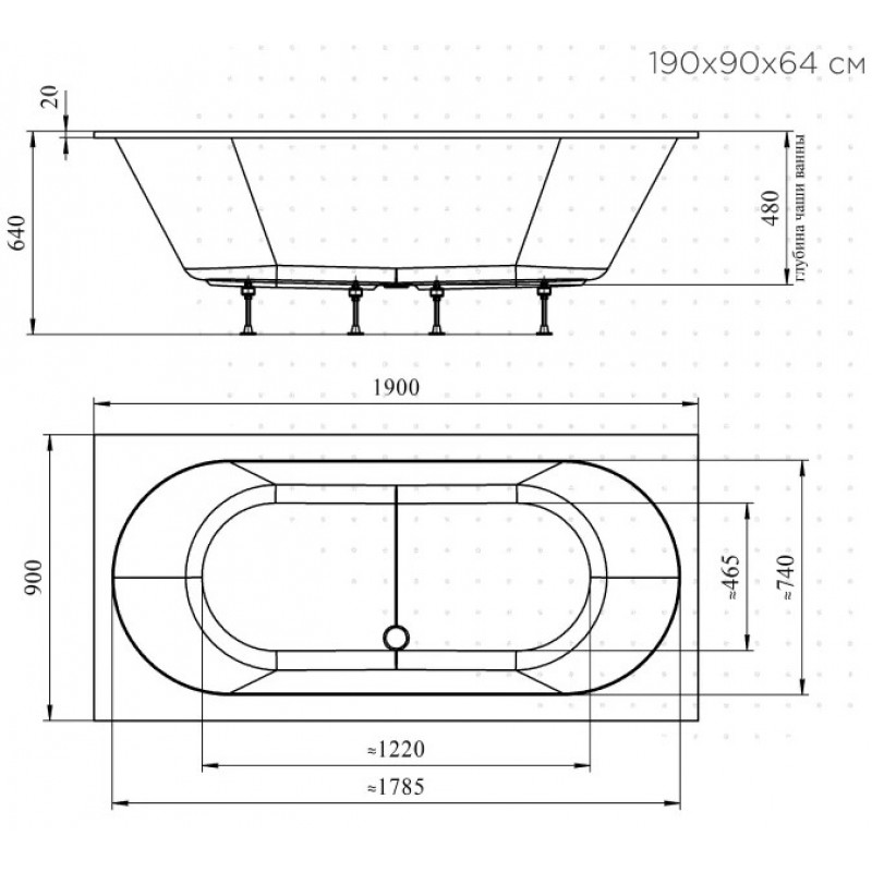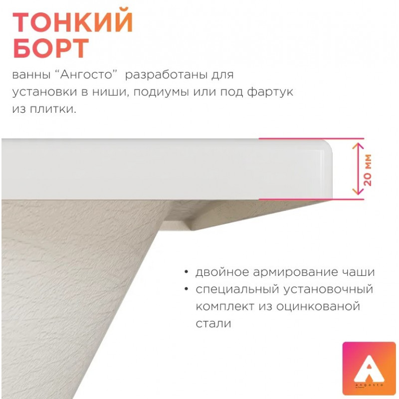 Ванна с тонким бортом, высота обрезки борта 20 мм для установки в нишу или под фартук из плитки.
