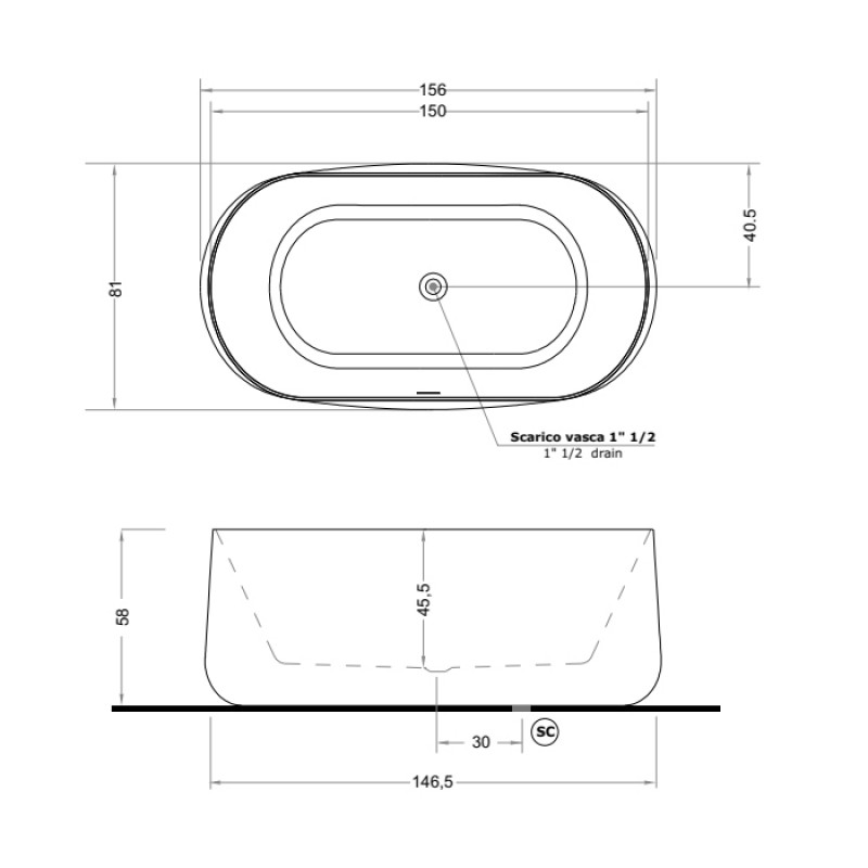 GRUPPO TREESSE CALIDA Ванна отдельностоящая акриловая c переливом, с сифоном