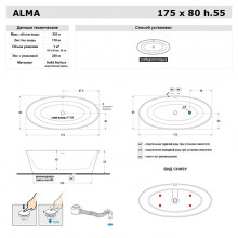 Gruppo Treesse Alma Ванна отдельностоящая 175х80х55 см, с сливом-переливом и сифоном, Solid Surface, цвет: белый матовый