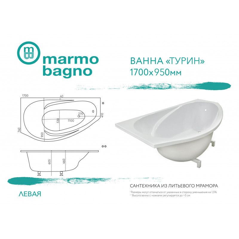 Ванна Marmo Bagno Турин из-за тщательно продуманного дизайна и нестандартных размеров отлично впишется в любую ванную комнату. Экраны к этим ваннам сделаны из легкого и прочного стекловолокна, что делает дальнейшее обслуживание встроенных систем удобным и доступным.
