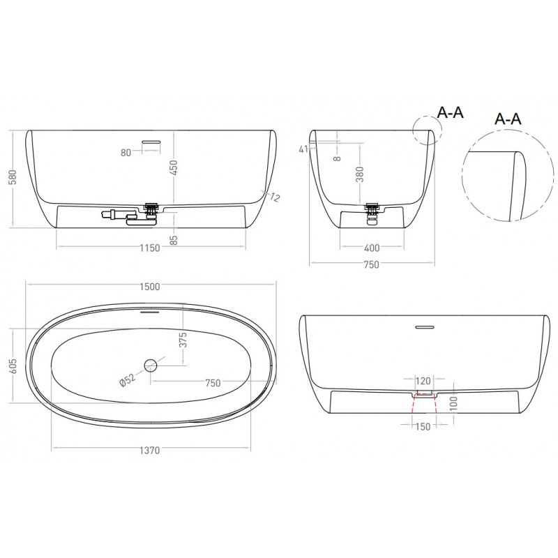 Ванна из литьевого мрамора Salini 100122M 150х75 белый матовый.
