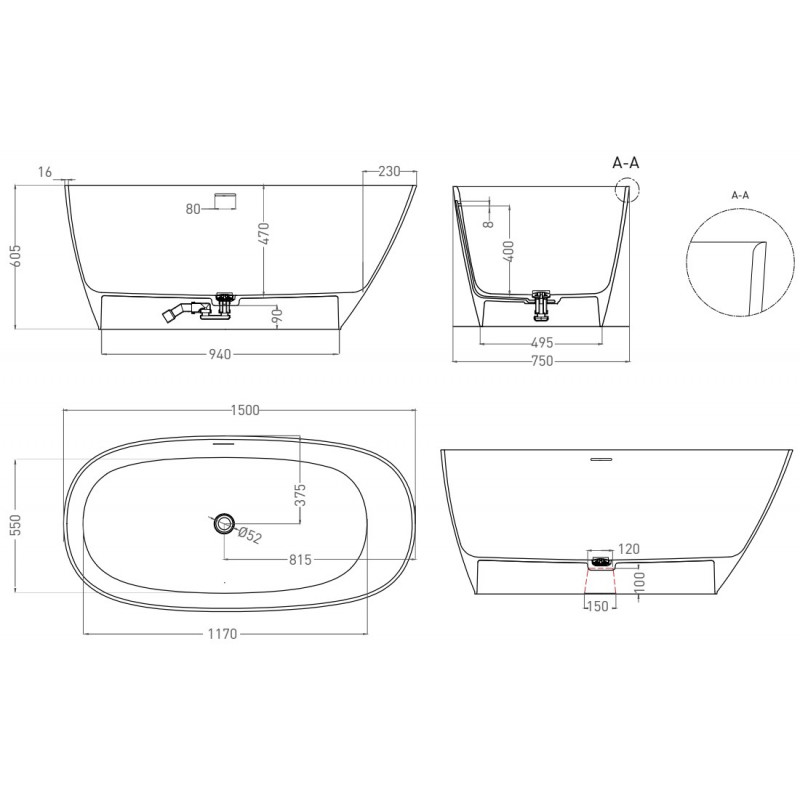 Ванна из литьевого мрамора Salini Sofia 102528M 150х75 белый матовый.